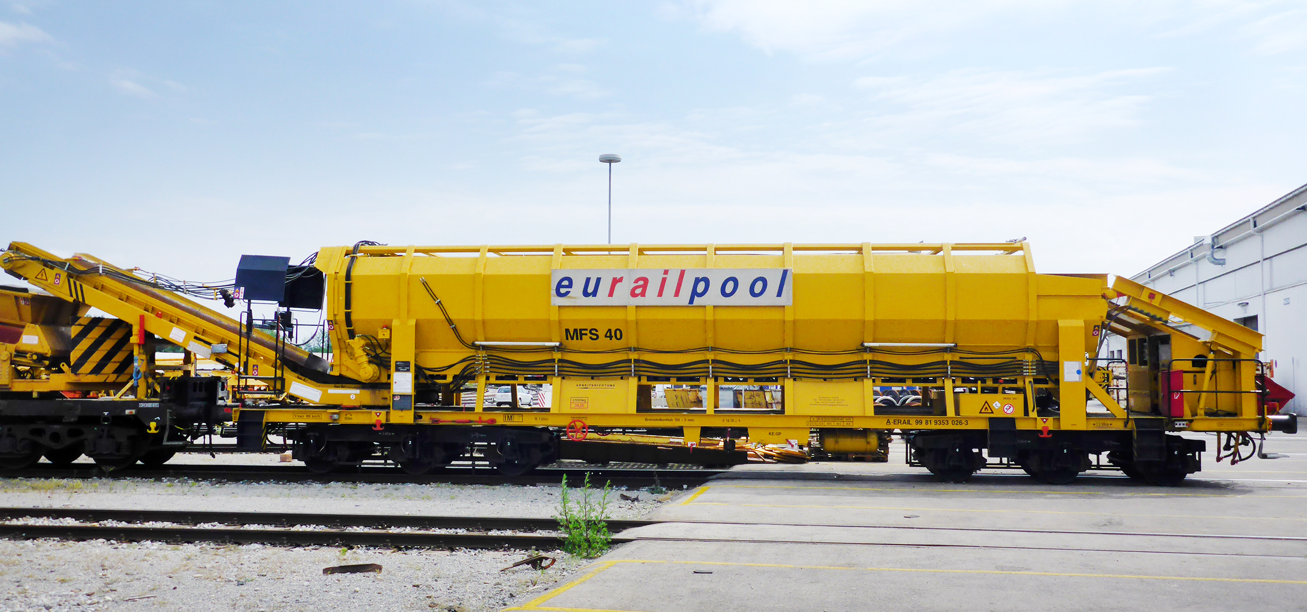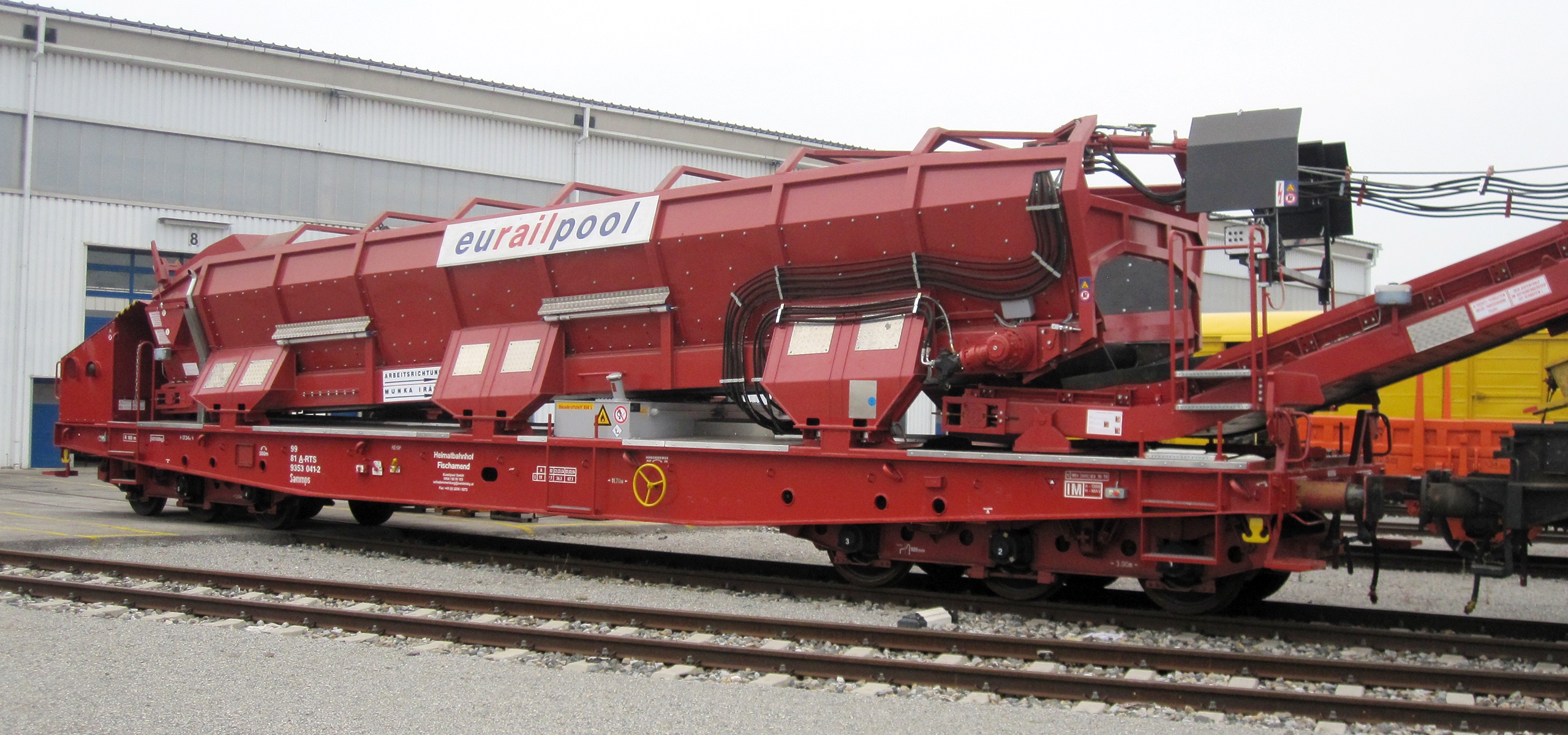 The material conveyor and hopper units serve both to supply material and to transport the excavated material away without using the adjacent track. Loading is carried out using a wheel loader or excavator via a loading station or directly into the MFS. The excavated material is unloaded to temporary storage sites or onto K wagons via swivelling conveyor belts.